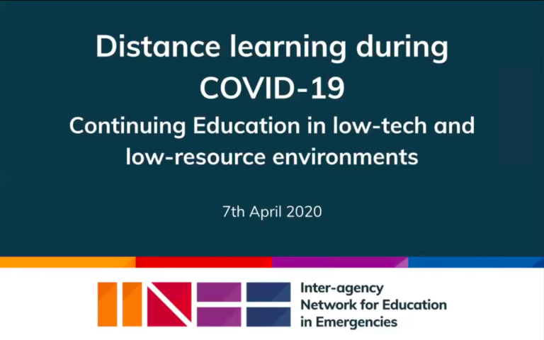 Summary: The third webinar of the INEE COVID-19 webinar series focused on providing distance learning in low-resource and low tech environments. The webinar highlighted the challenges currently facing Education in Emergencies (EiE) practitioners in the face of the school closures and restricted movement associated with COVID-19. EiE actors shared guidance and recommendations for continuing learning along with practical examples. Here are the links to the webinar recording, as well as the webinar slides.