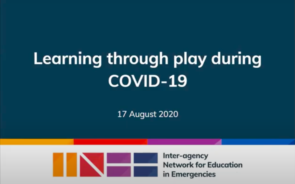 Summary: Learning through play during COVID-19 was part of the INEE COVID-19 webinar series and highlighted how EiE practitioners can use “learning through play” approaches during COVID-19 response and recovery. The discussion focused on how play can be used to foster social emotional learning (SEL) in addition to academics. Panelists provided an overview of how they are adapting existing learning through play responses to the COVID-19 context in a variety of settings and how others can integrate similar approaches in their work during the pandemic, whether through distance learning or as in-classroom instruction resumes.